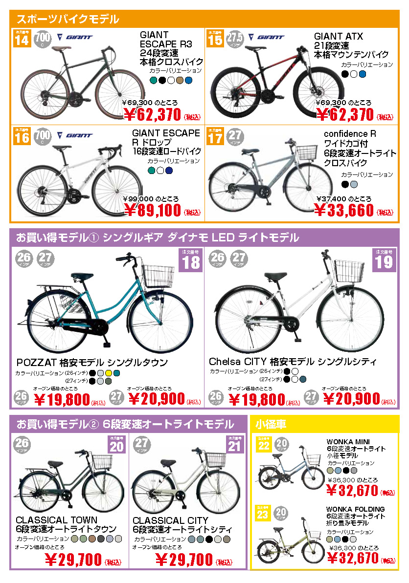 ※すべての車種に防犯登録600円とTSマーク1,900円の合計2,500円(非課税)が別途必要です。