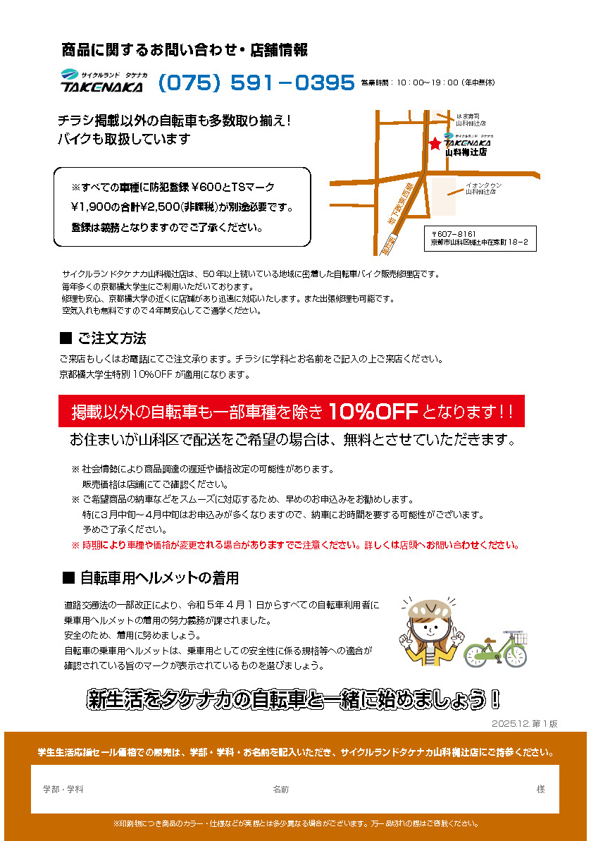 株式会社たちばなリンク(学校法人京都橘学園100%出資の事業会社)と、大学近隣の自転車販売店サイクルランドタケナカ山科椥辻店との共同企画で、京都橘大学入学生を対象に、大学生活4年間・安全に使える自転車を特別価格で販売します。
