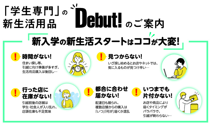 ひとり暮らしに必要な家具家電・生活雑貨の購入は、提携会社(株式会社シングルライフコミュニケーションズ)が運営するご利用者のべ約23万人のまとめて買える 通販サイト「Debut!」をご利用ください。