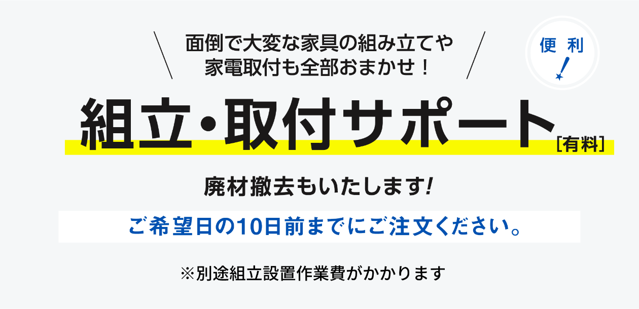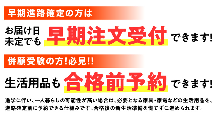 家具・家電の合格前予約が可能!お得な新生活応援家電セット、ワンルームマンション向けにセレクトしたオススメ家具セットや布団・カーテン、ランドリー・キッチン雑貨など、約500アイテムを取り揃えています。